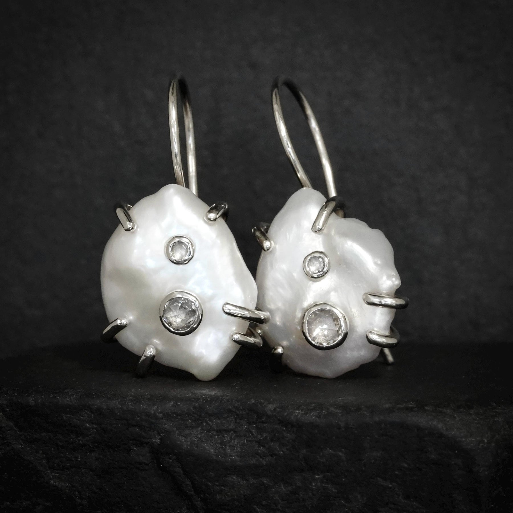 White Pearl and Clear Diamond Dangling Earrings. Unique White Gold White Freshwater Pearl and Rose Cut Diamond Earrings. Wedding Jewelry