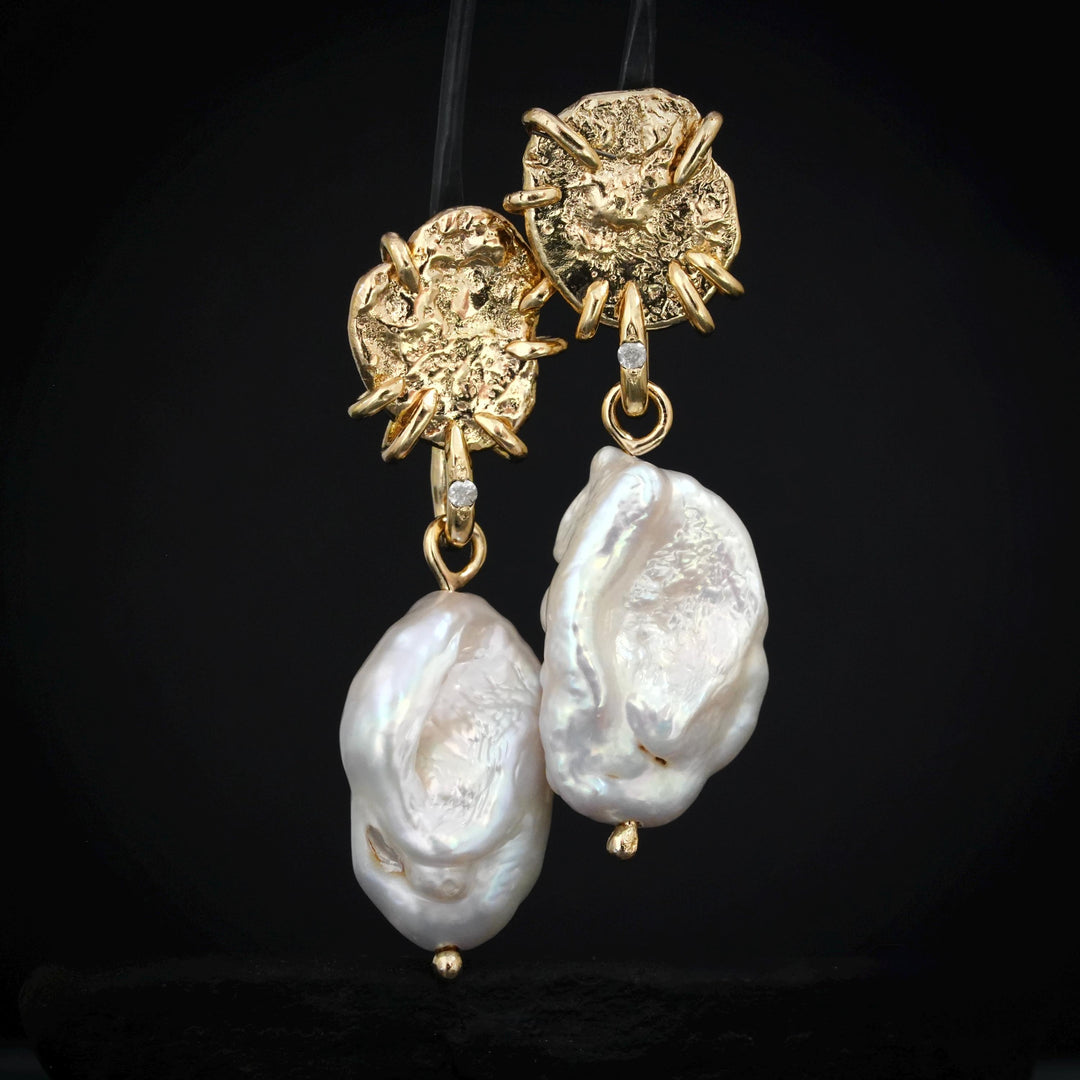White Pearl and Diamond Earrings // Unique 14k Yellow Gold White Freshwater Pearl and Natural Diamond Post Earrings // Wedding Ceremony Earrings