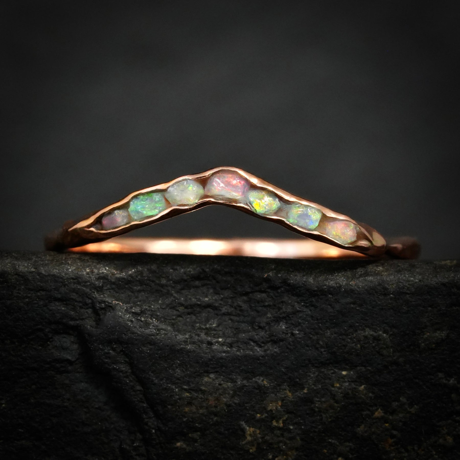 Opal Wave Ring // Solid Rose Gold Unique Alternative Rustic Natural Raw Rough Uncut Fire Rainbow Bezel Set Australian Opal Wedding Band Ring // Australian Opal