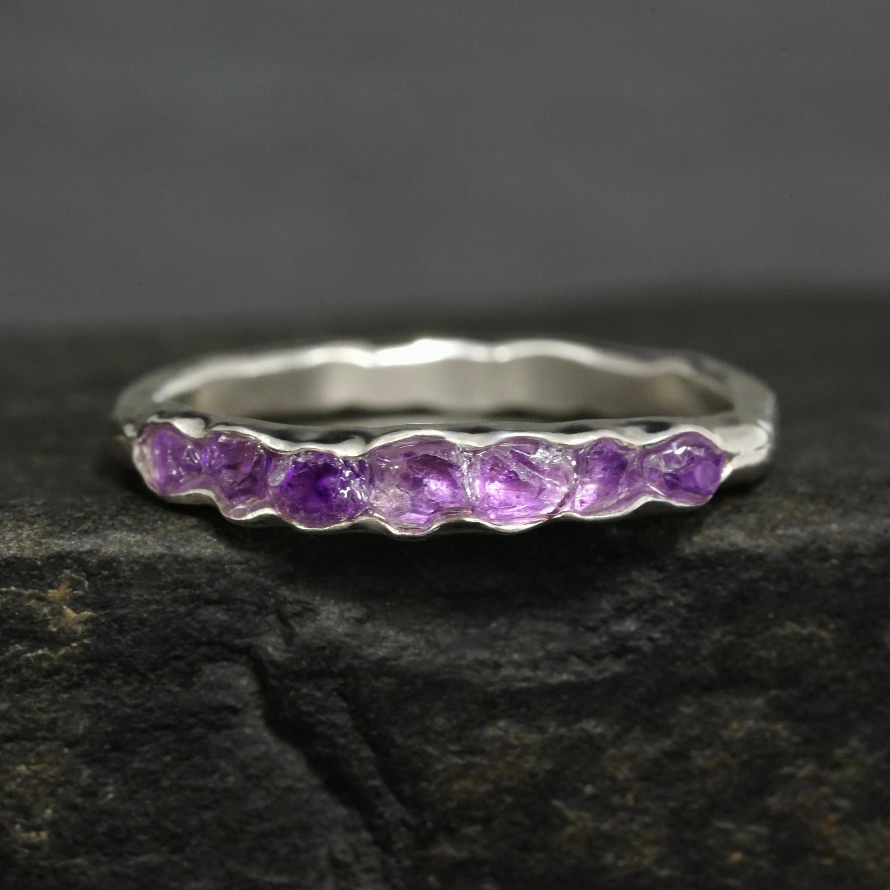 This listing is for one raw natural Amethyst band ring. Pictured ring is in sterling silver.