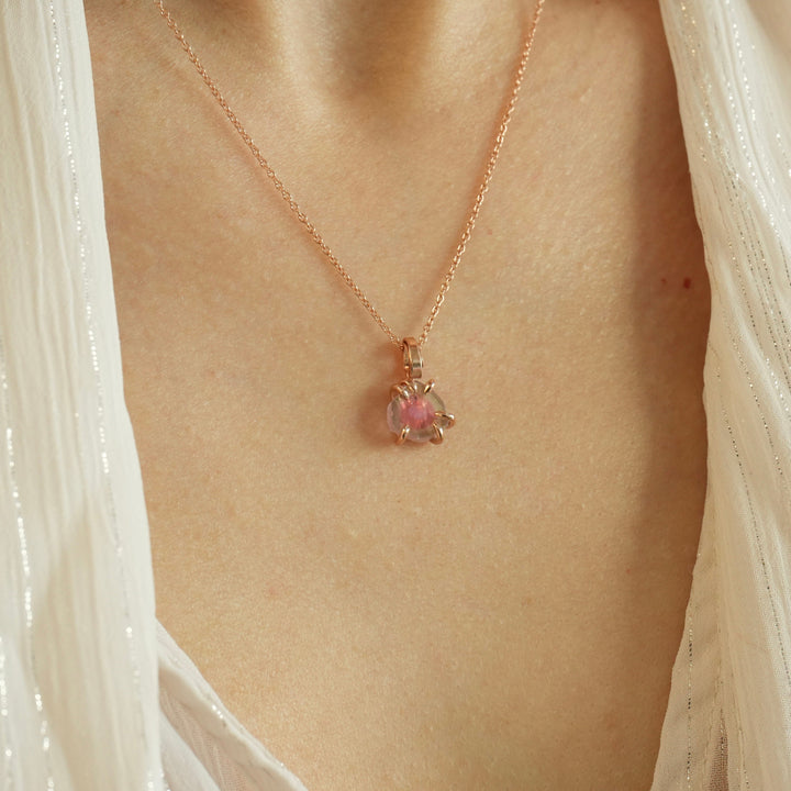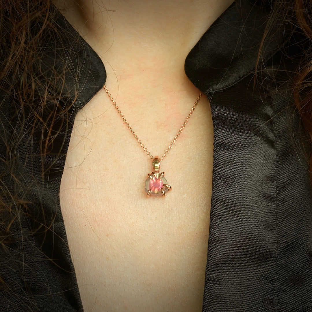 This listing is for one raw bi-colour pink and green Tourmaline necklace. Pictured necklace is in 14k rose gold.