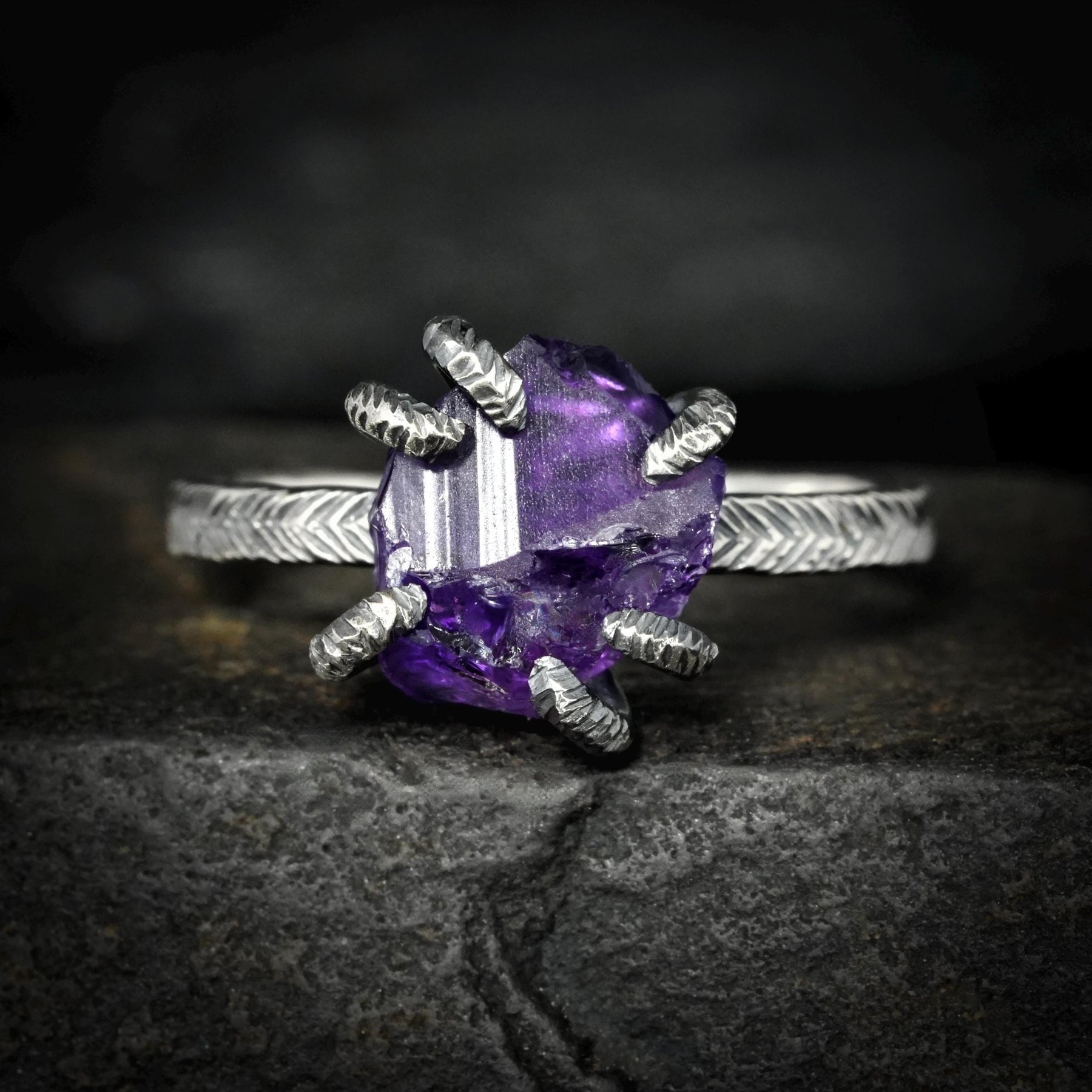 Raw Amethyst Ring // Rustic Organic Alternative 6 Prong Set Raw Rough Uncut Purple Gemstone Natural Amethyst Engagement Statement Ring