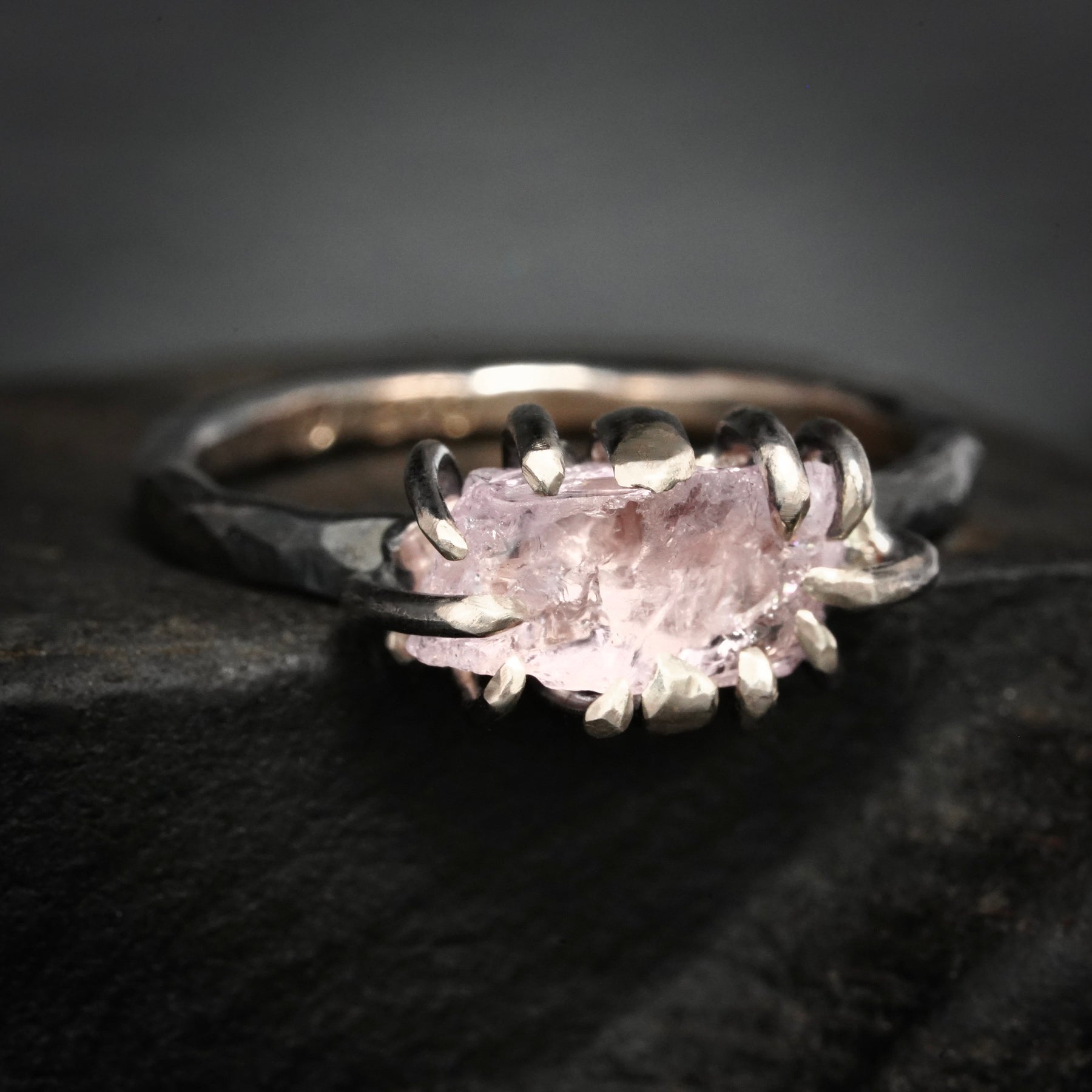 This listing is for one raw Morganite crystal ring. Pictured ring are in 14k rose gold with fire marks on a band and oxidised 925 silver.