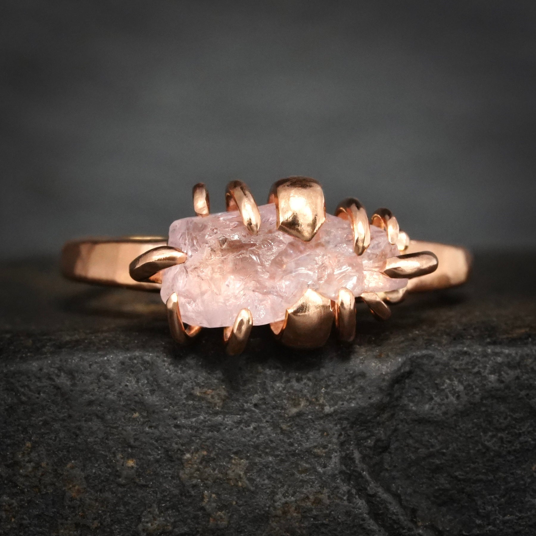 This listing is for one raw Morganite crystal ring. Pictured ring is in 14k rose gold with shiny satin finish.
