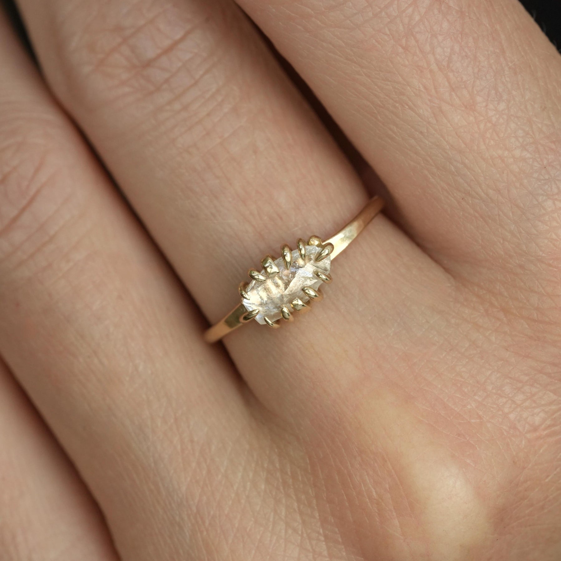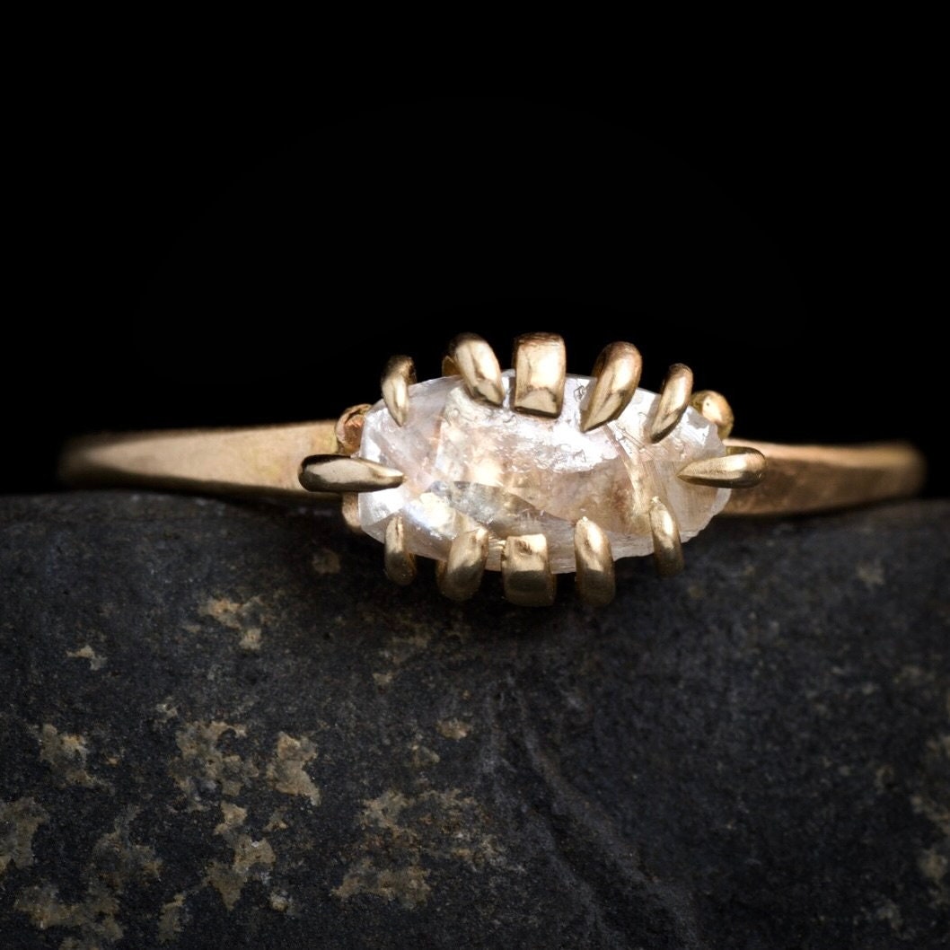 Diamond Crystal Ring: RTS 14k Solid Yellow Gold 12 Prong Set Natural Untreated and Uncut Raw Clear Diamond Ring in US size 5.75 / UK size L