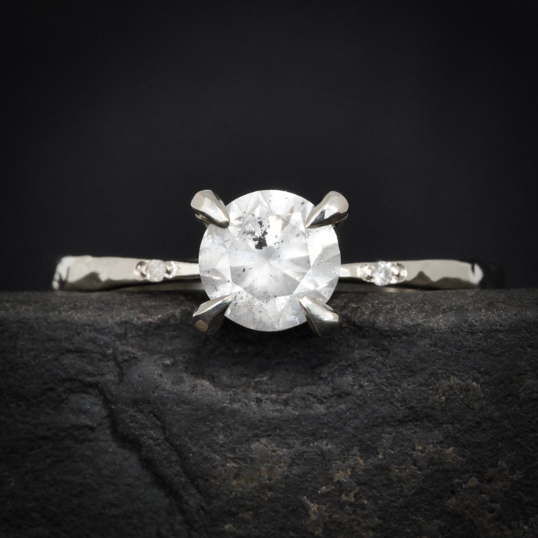 Galaxy Diamond Ring: RTS 14k Solid White Gold Round Brilliant Cut 5.7mm Salt and Pepper Prong Set Natural Diamond Ring in US size 6.5