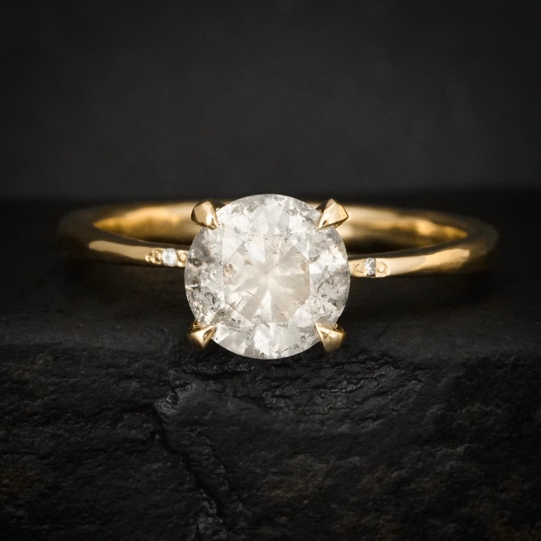 Galaxy Diamond Ring: RTS 14k Solid Yellow Gold 4 Prong Set Round Brilliant Cut Natural Salt and Pepper Diamond Ring in US size 6.75