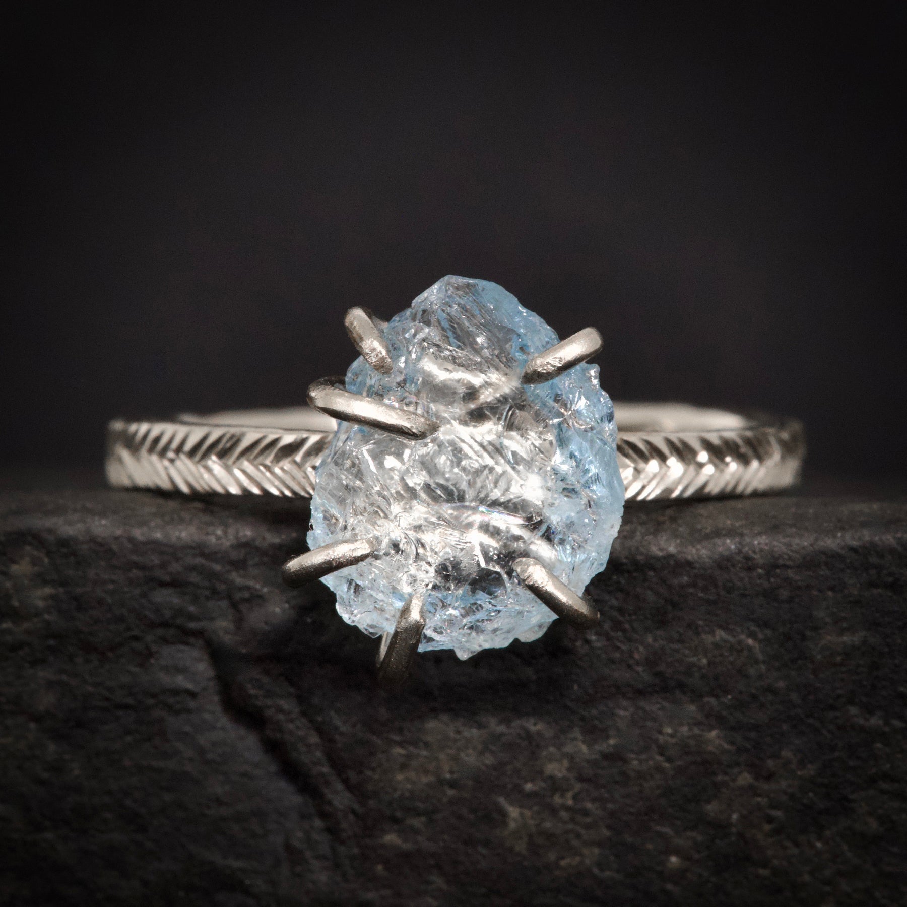 Aquamarine Ring // RTS 18k/750 White Gold Raw Rough Uncut Cutting Grade Sky Blue Aquamarine Prong Set Engagement Ring in Size US 7.5