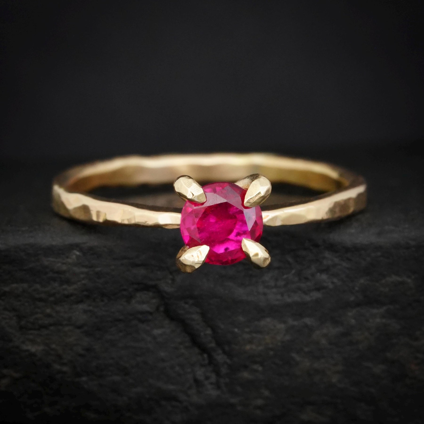 Ruby Ring: RTS Solid 14k Yellow Gold 4 Prong Set Round Brilliant Cut Ruby Hammered Textured Band Ring in US size 6.75 / UK size N