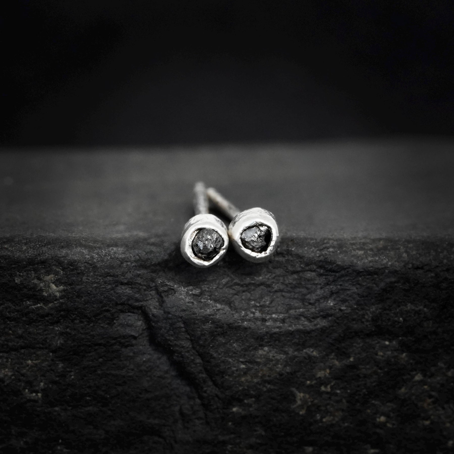 Tiny Black Diamond Studs: RTS Solid 925 Sterling Silver Raw Uncut Bezel Set Round Black Diamond Stud Earrings