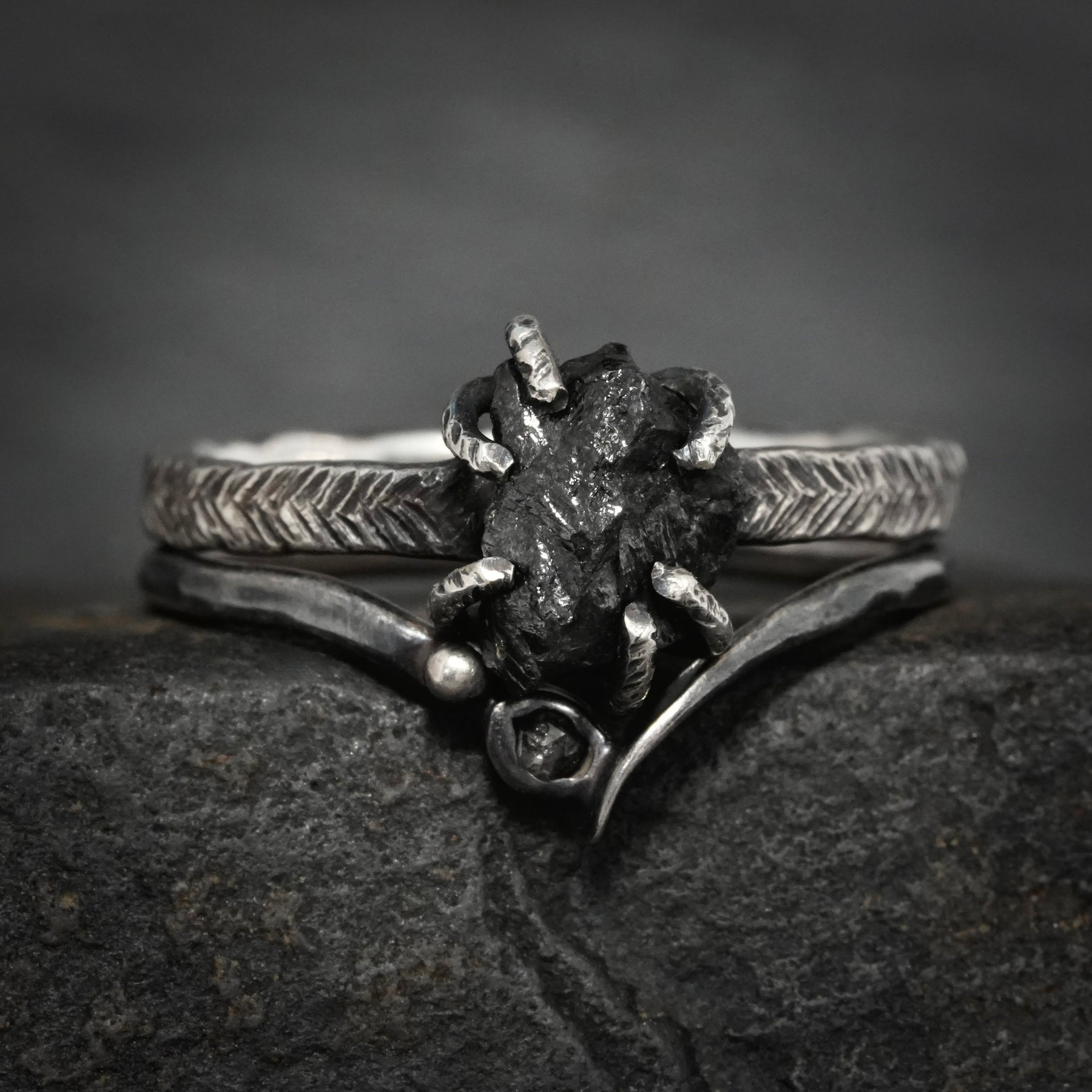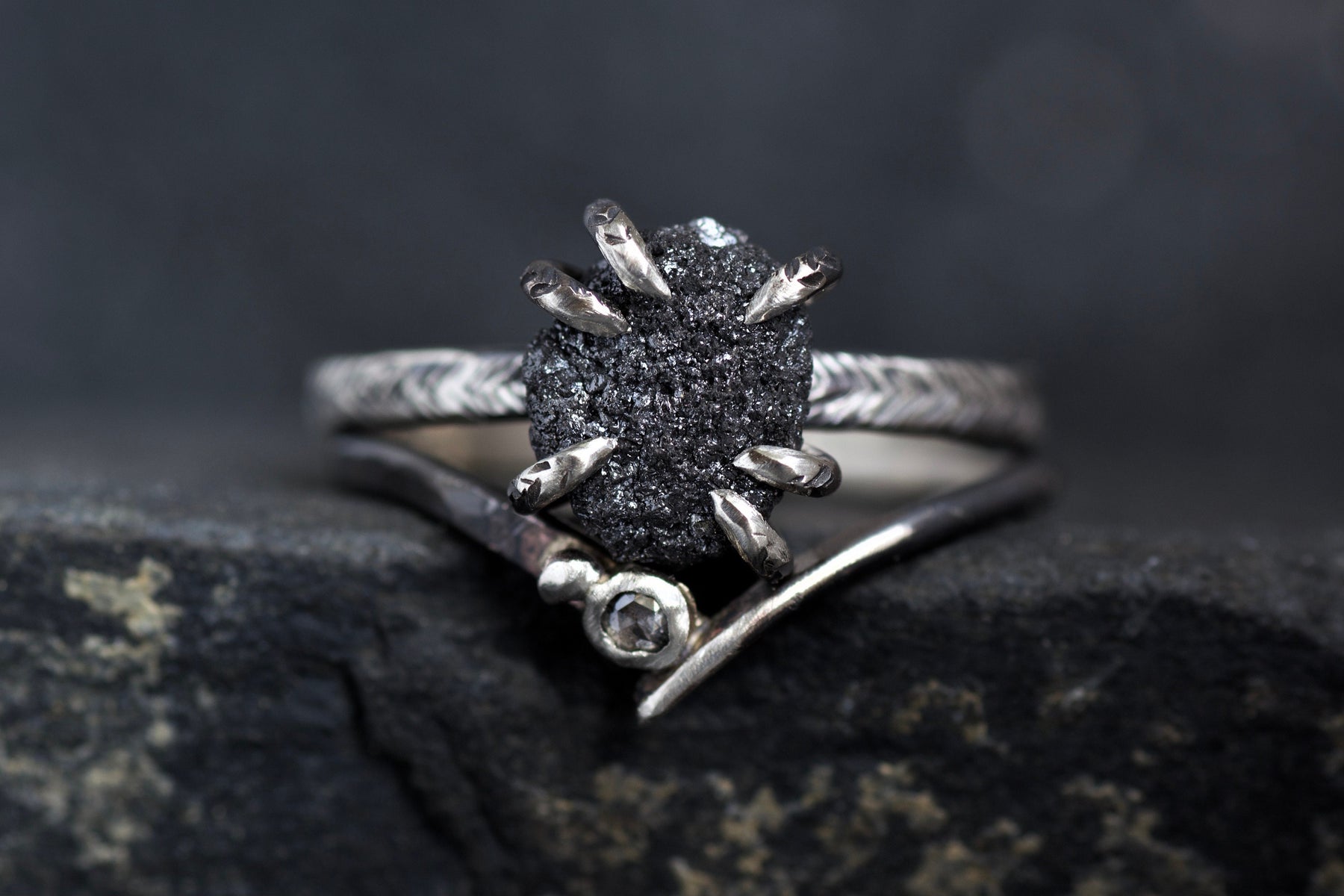 This listing is for 2 rings - chevron wedding band and raw black diamond engagement ring. Some photos with very different design are for illustrational purpose to show band finish. The pictured rings are all with oxidized or fire marks finish.