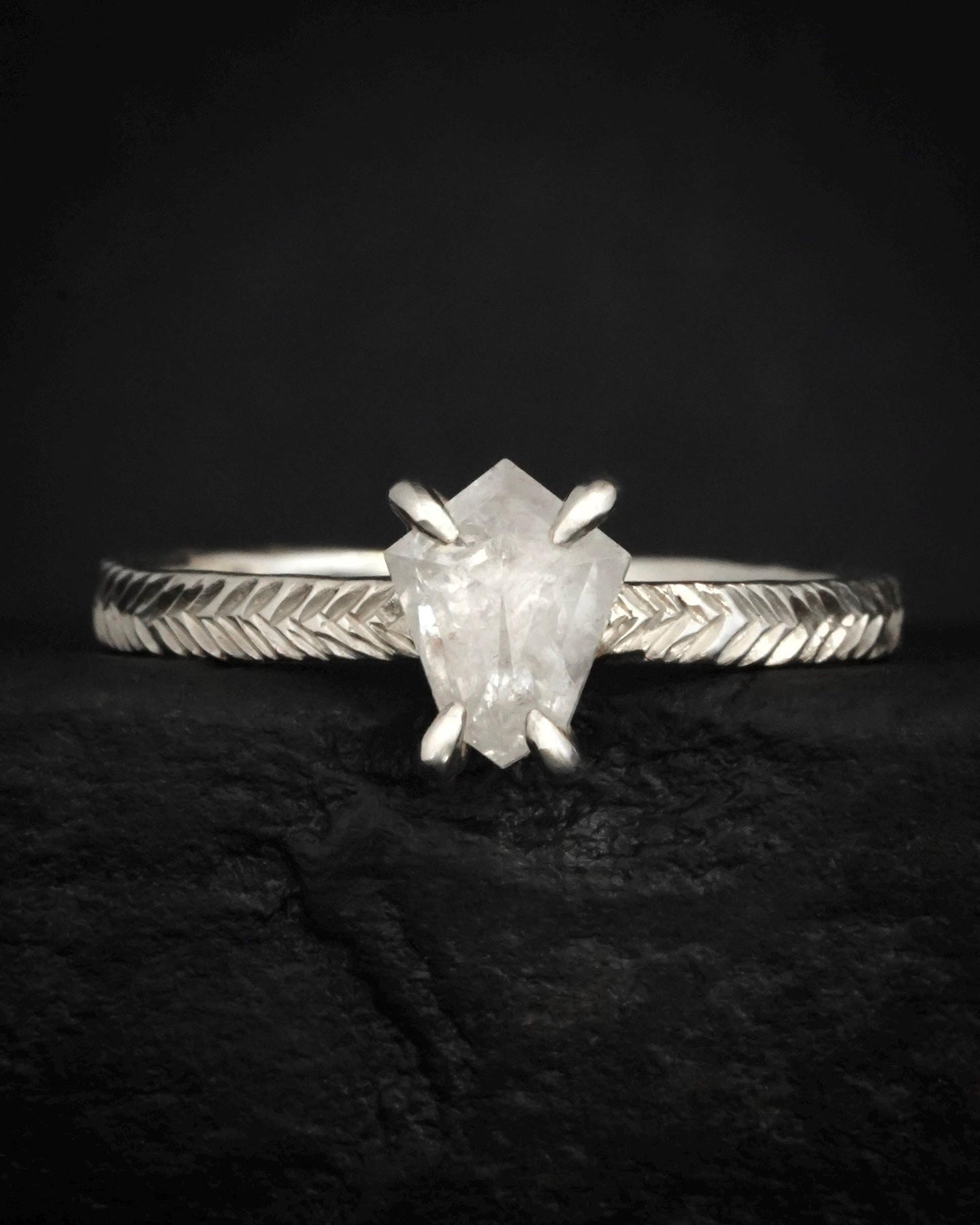 A shield-shaped white Diamond with a form that feels protective and grounded. The geometry creates presence without excess detail. Worn as a statement or engagement ring.